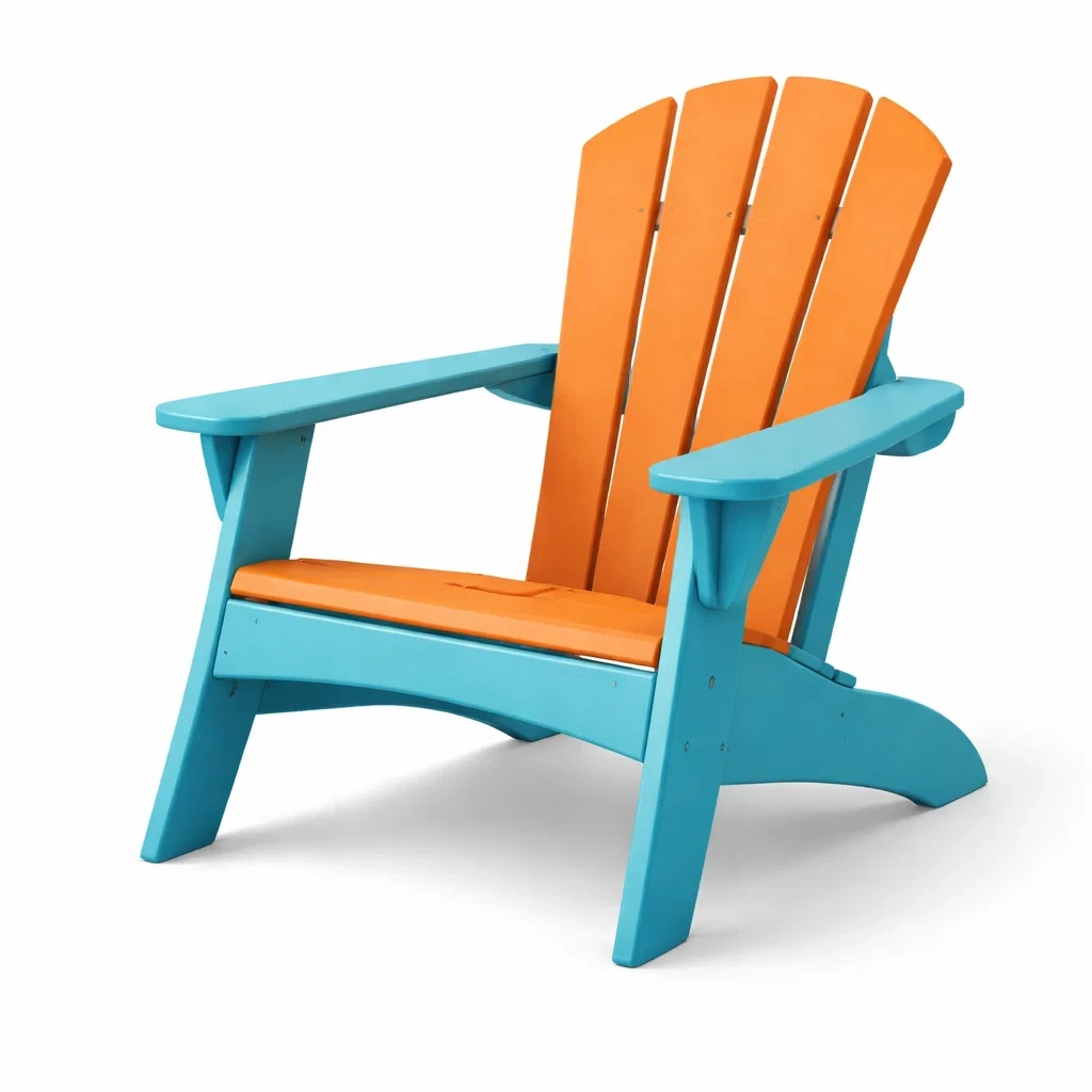 Der Adirondack Stuhl besteht aus strapazierfähigem Polyethylen. Die Hauptfarbe ist Orange, während die Hilfsfarbe Blau ist. Der Stuhl hat die Maße 90 cm Länge, 80 cm Breite und 100 cm Höhe und wiegt 15 kg. Er ist wasser- und rostbeständig und eignet sich für den Außenbereich. Zur Reinigung kann ein feuchtes Tuch verwendet werden.